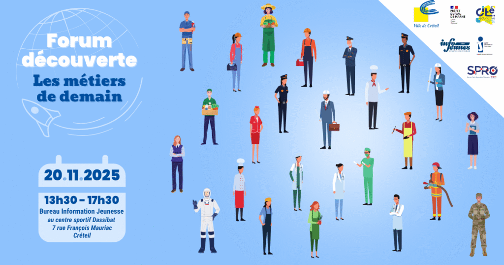 Tu t’interroges sur ce que tu veux faire plus tard ? Viens rencontrer des professionnels, tester des animations et poser toutes tes questions sur les secteurs d’avenir lors du forum « Les métiers de demain » de Créteil !