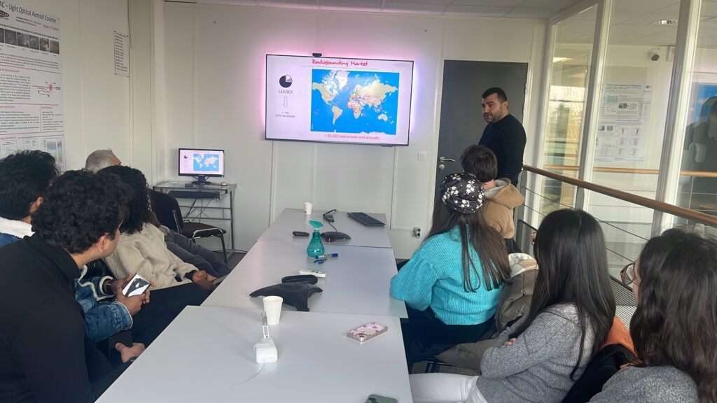 - Visite des locaux de Météo Modem, notamment des zones de fabrications des sondes : imprimantes 3D, imprimantes à circuits imprimés, antennes de télécommunication, liste des canaux UHF autorisés (autour de 402 mhz), etc. Au cours de cette visite, les étudiant·es ont rencontré une vingtaine d’ingénieur·es, techniciens et techniciennes en éléctronique, mécanique et design.