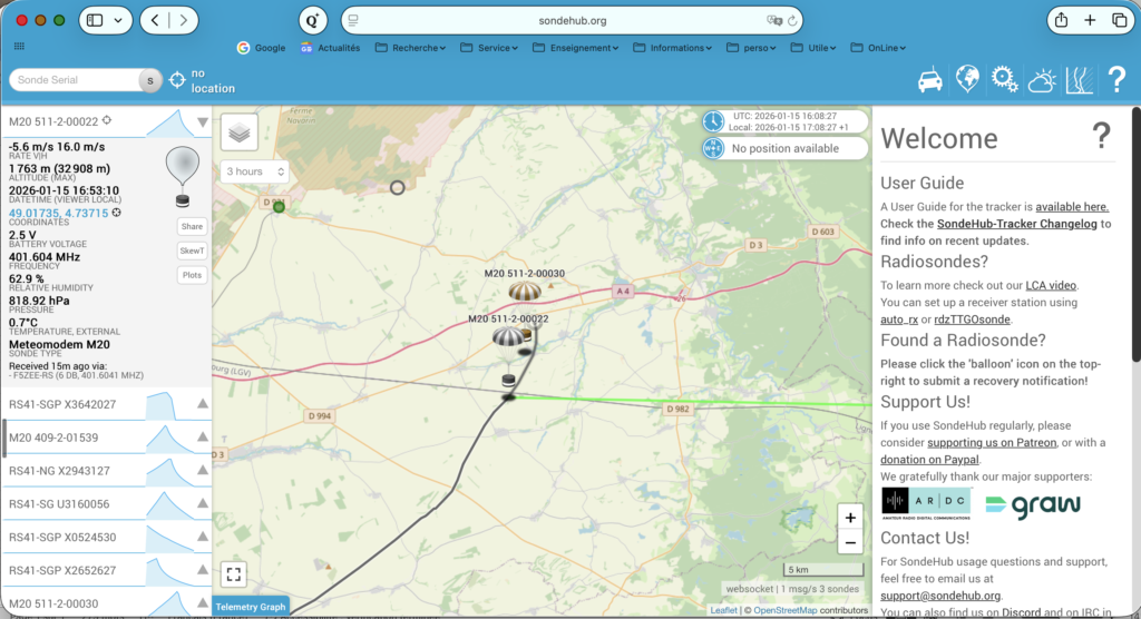 - Suivi en temps réel du ballon sur écran via le logiciel en ligne gratuit et accessible à tous et toutes : SondeHub Tracker