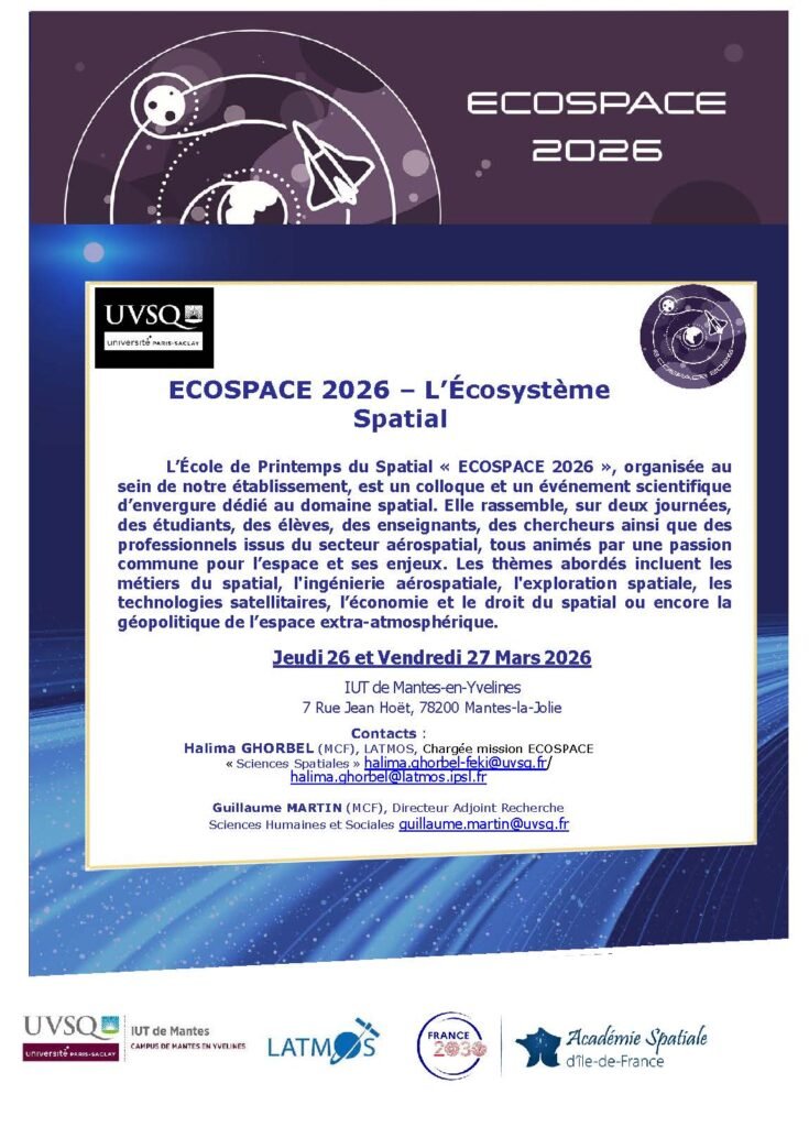 L’École de printemps du spatial « ECOSPACE » est un colloque et un évènement scientifique co-organisée, depuis 2025, par l’IUT de Mantes-en-Yvelines, le LATMOS et l’Académie Spatiale. Cet évènement sur deux jours est dédiée aux enjeux et aux avancées du domaine spatial : sciences, économie, technologie, droit et géopolitique.