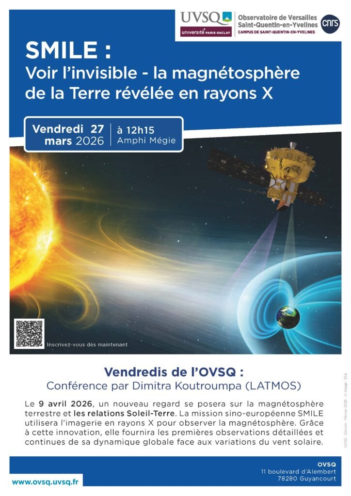 Dans le cadre des Vendredis de l’OVSQ, Dimitra Koutroumpa, Chercheuse au Laboratoire Atmosphères et Observations Spatiales (LATMOS), donnera une conférence le 27 mars 2026 à 12h15, intitulé « SMILE : voir l’invisible – la magnétosphère de la Terre révélée en rayons X ».
