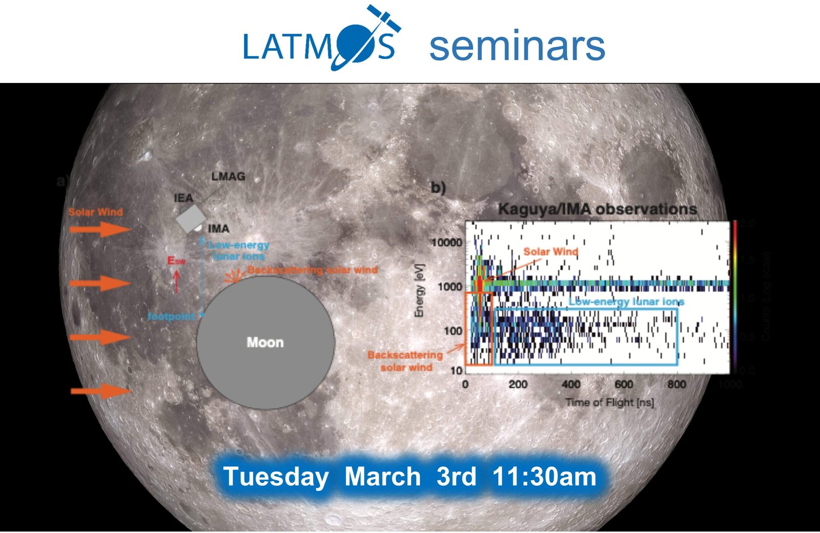 Mardi 3 mars, Kei Masunaga (Yamataga Univ.) donnera un séminaire intitulé « Observations of lunar surface-origin and exospheric ions by the Kaguya Ion Mass Analyzer ». Le séminaire aura lieu à 11h30 au LATMOS à Guyancourt en salle 2202. Il sera retransmis sur Zoom.